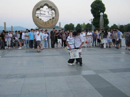 “兩人一腳”,一邊賣力的向前進(jìn),一邊還要保護(hù)報紙不能有破損。瞧這“兩兄弟”感情多好,不斷引來陣陣笑聲。