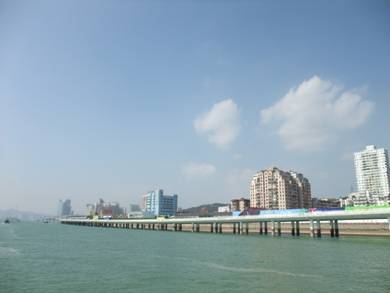 從導游宋小姐口中得知,海滄大橋乃是世界第二,亞洲第一的特大型三跨全漂浮鋼箱梁懸索橋,全長五千多米(嘿嘿,當時沒記住詳細數(shù)據(jù),查資料得知全長5926.527米,主跨648米);大橋的索塔采用門式結構,橋柱各部結構采用曲線造型為基調的設計構思,型體上線條流暢,輕柔,使大橋本身也為了一座藝術精品。 遠遠望去,銀藍色的橋體與碧藍色的天空相輝映,似長虹如玉帶般橫臥在粼粼的海面上。一條條平行鋼絲索股,掛在門式索塔上,舉目望去行駛的汽車仿佛飛翔在藍天碧海中,縱橫交錯,真是美不勝收的畫卷。